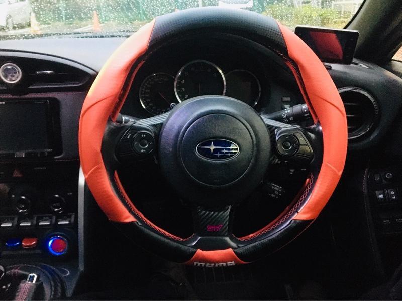 Купил рулевое покрытие MOMO. Раньше был противником таких вещей, но купил для защиты штатного руля. Размер S. Позиция „10 и 10“ немного съехала, но это же универсальная вещь, придётся терпеть. Думаю, на BRZ такое обычно не ставят... Руки у меня крупные, кожа сухая, поэтому штатный руль скользит и неудобно лежит. Поменял со Sparco. У Sparco алькантара была хороша, но даже размер S со временем сползал. А это — не сползает! И ещё: карбоновый принц и перфорированная кожа не скользят. Оказывается, у MOMO много всего. Цена чуть выше других. В позиции „10 и 10“ руль стал толще. Немного красного видно снаружи — смотрится классно».