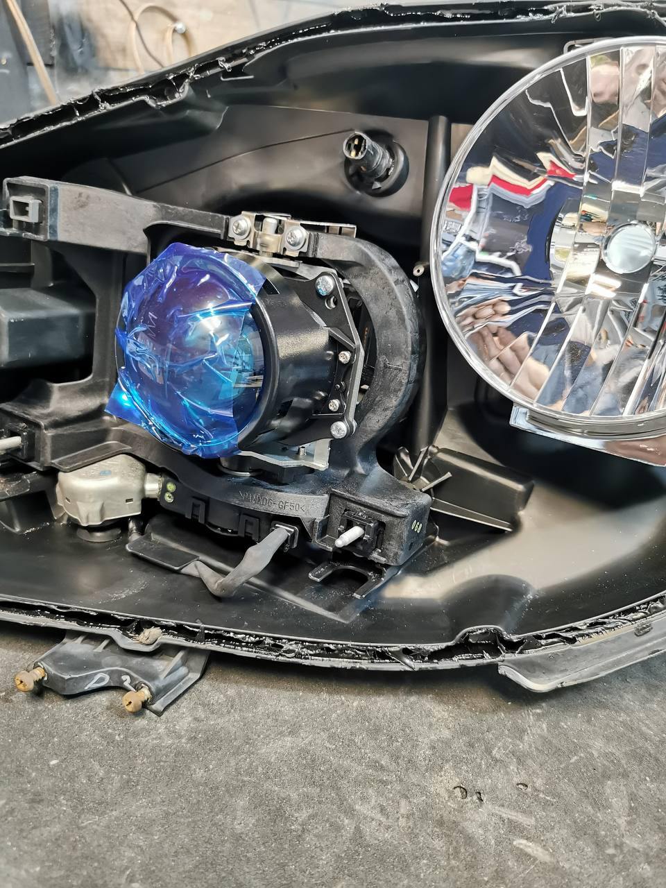 Разобрали корпус фары, удалили старый герметик. Установили Biled с помощью переходных рамок в штfное место, полностью сохранив функционал AFS. Стекла фар были отполированы с градацией от 500ед. до 3000ед. Большинство сколов ушло, появилась прозрачность и приятный вид. Добавили габаритные лампы Led от MTF для эстетики.